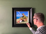 The finely rendered details in the face are evidence of the artist's skill. From the shadows on the models face from his eyelashes, to the shine on the boots and the holster, this is a painting of exceptional quality and confidently stands as one of the artist's finest, small scale works.
